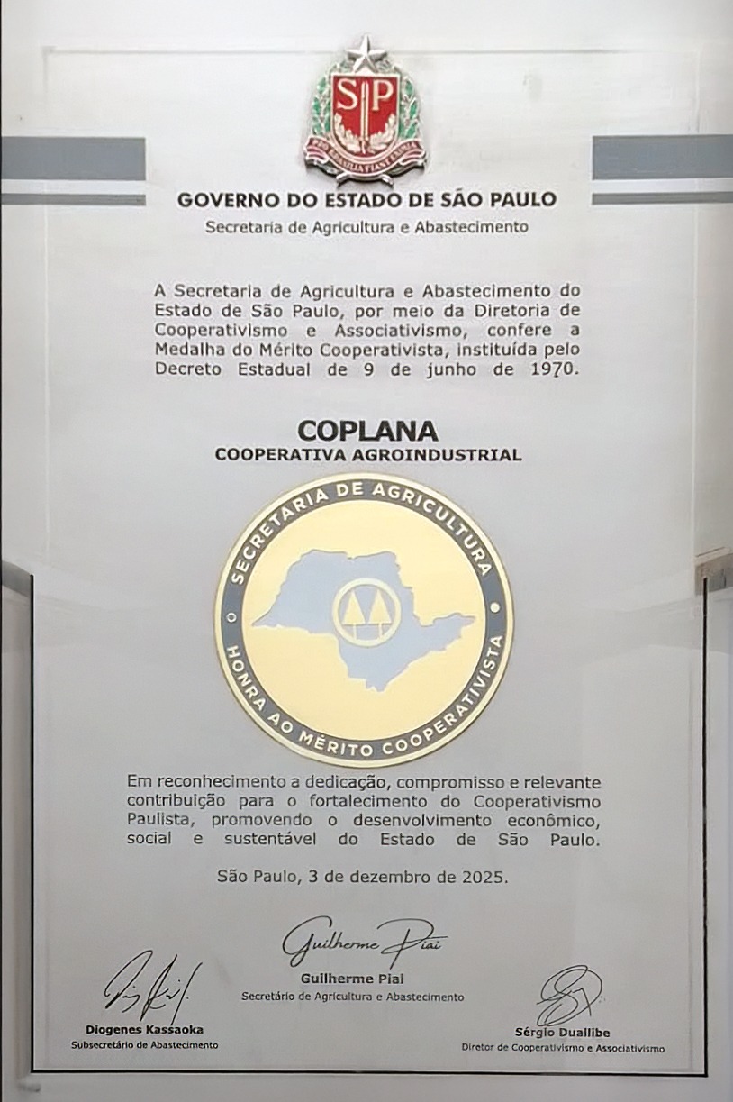 A Coplana foi uma das nove cooperativas reconhecidas pela Secretaria de Agricultura e Abastecimento de São Paulo (SAA) com a Medalha Mérito Cooperativista, em cerimônia no Salão Nobre da Secretaria, na capital paulista (3/12). A homenagem destacou o pioneirismo e a liderança no setor de amendoim, sustentados por três pilares: referência em Amendoim Premium, crescimento com inovação e sólida governança.